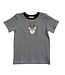 Boys buck t-shirt has buck applique on front and is black & white striped with black crew collar.