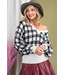 Plaid printed knit sweater with a v-neck, balloon sleeves, and a cinched waist. Available in two colors, black and merlot. Read more.